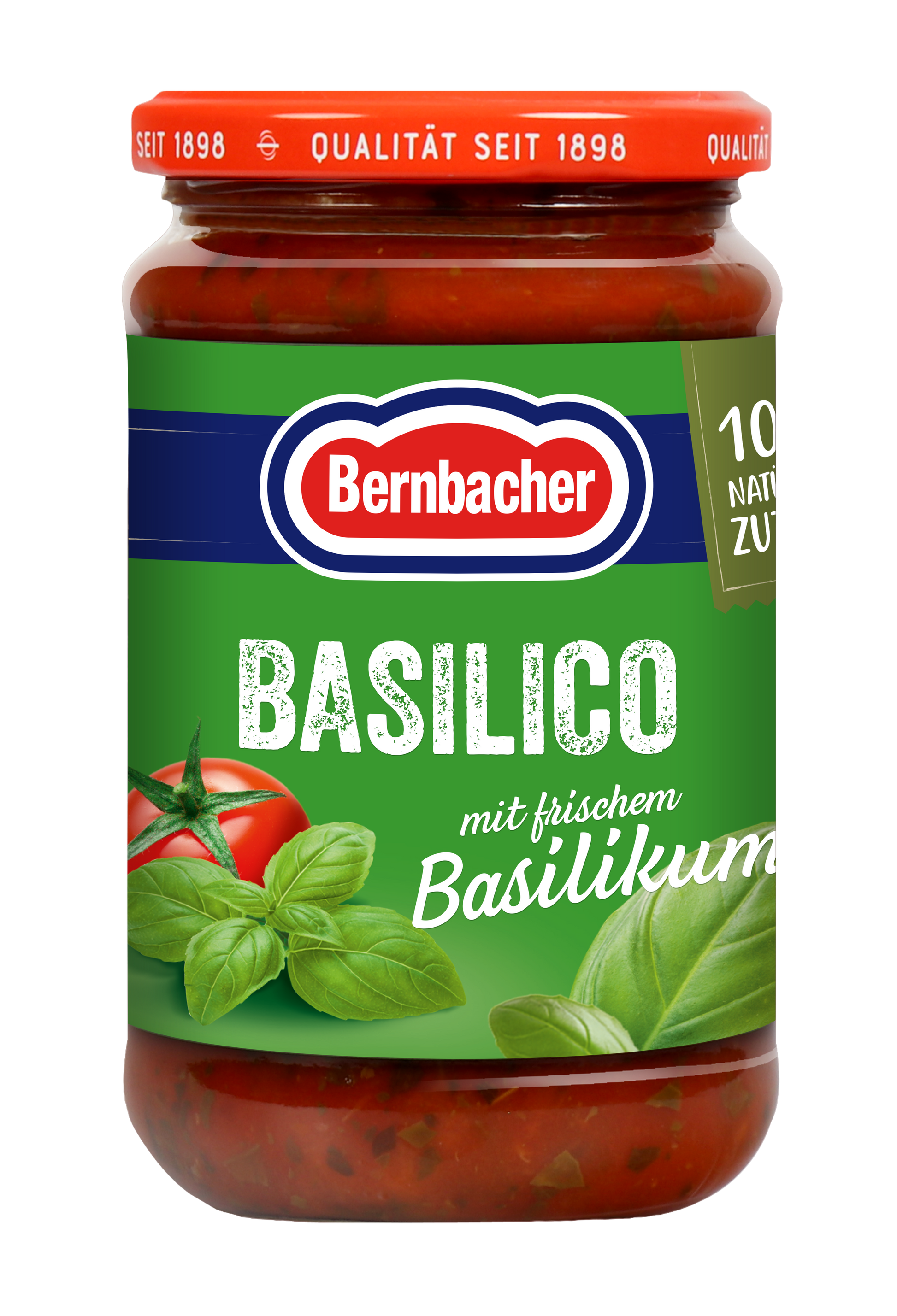 Bernbacher Sauce Basilico ist auf Nudeln und Pizzen das reinste Vergnügen: Zum Verfeinern des fruchtigen Tomatengeschmacks wird ausschließlich frisches Basilikum verwendet.